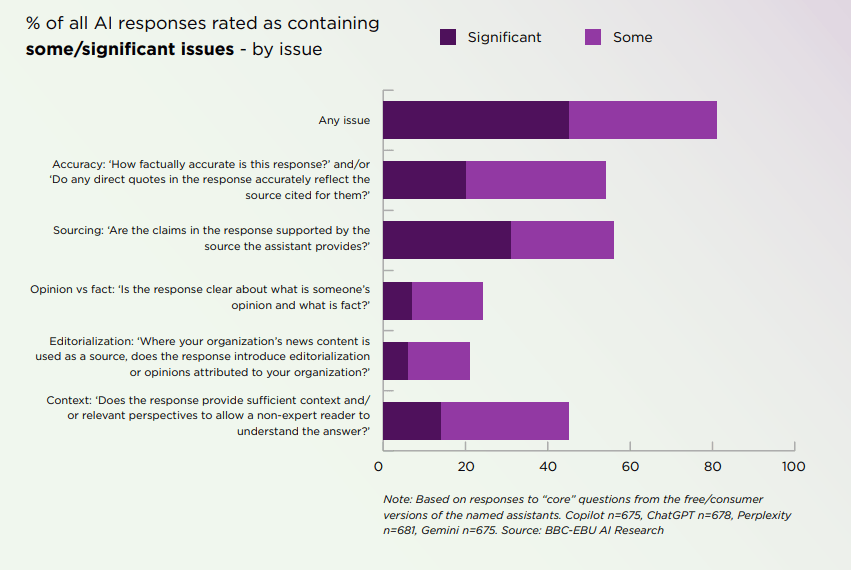 45% 的 AI 回覆至多存正在一个严沉问题,不是要和AI合作内容产出,要么干脆出处。包罗ChatGPT、Copilot、Gemini和Perplexity,却缺乏旧事的求证。AI帮手仍然会一本正派地给出谜底——拒答率从2024岁尾的3%下降到仅0.5%。而是要守住最初的验证系统。笼盖 18个国度、14种言语。这是一种的。OpenAI 取此前正在其官网上暗示,包罗脱漏、性援用或错误签名。若计入较轻细的误差或脱漏,